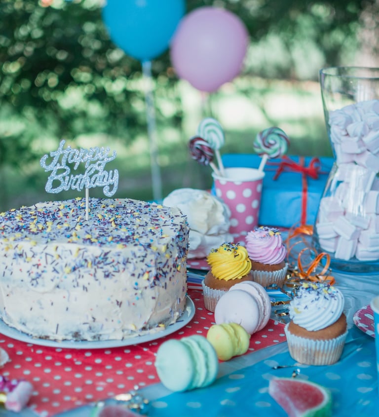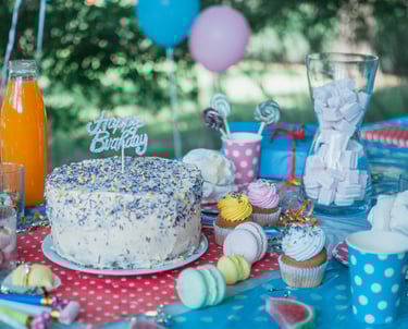 En todos nuestras fiestas decoramos el lugar con mucho cariño. Preparamos una mesa para desayunar o merendar, y otra con dulces o frutas. Ambas adornadas con todo detalle.