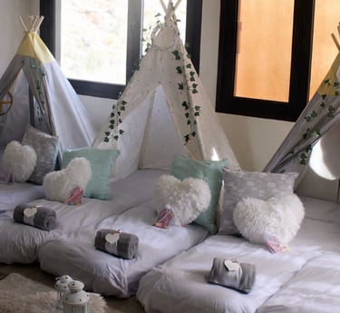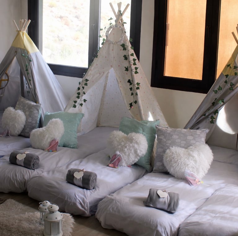 Las Pijama Party de Mamá Oca Eventos convierten cualquier rincón de tu casa en un espacio mágico y acogedor para disfrutar de una noche especial con amigos. Nos encargamos del montaje por la tarde y de la recogida a la mañana siguiente.